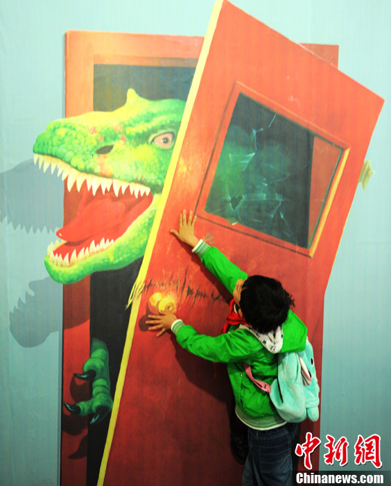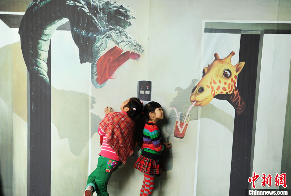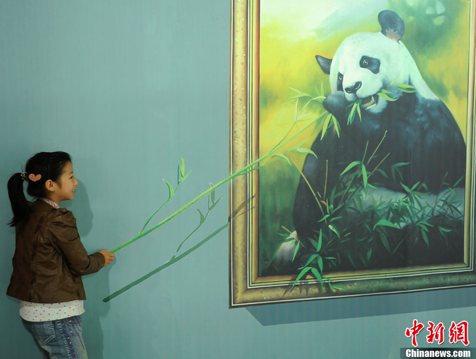 10月19日,成都4D空间体验馆内的喂熊猫画吸引孩子现场体验。当日,2000平方米内出自海内外著名画家之手的百余幅3D立体魔幻画吸引了许多民众体验。逼真的效果,让一些小朋友被吓得躲在了父母身后。此次4D空间体验馆将持续到11月20日结束。中新社发 刘忠俊 摄