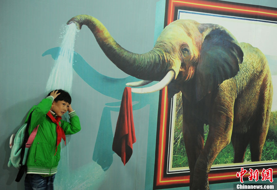10月19日,成都4D空间体验馆内的3D画大象给孩子“洗澡”。中新社发 刘忠俊 摄