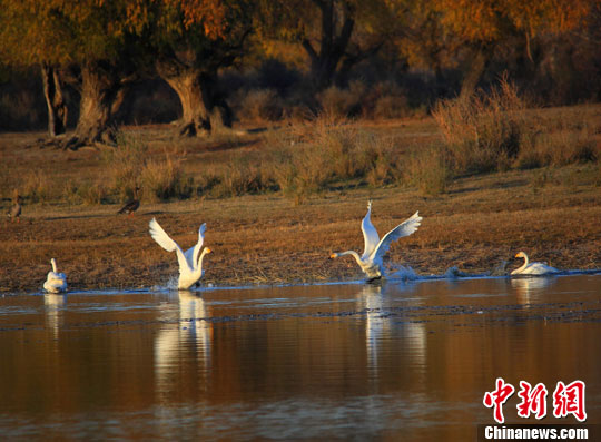 白天鹅在哈巴河嬉戏、觅食。刘是何 摄