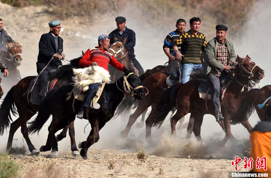 10月19日,新疆尉犁县在罗布人村寨举办了叼羊大赛。当天的叼羊大赛共有6支队伍参赛,每队8名选手,比赛共分为三场,两两展开对决,获胜队将获得1000元奖金。图为选手们在赛场上激烈角逐。确·胡热 摄