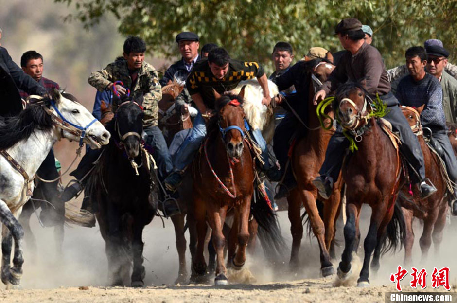 10月19日,新疆尉犁县在罗布人村寨举办了叼羊大赛。图为选手们在赛场上激烈角逐。确·胡热 摄