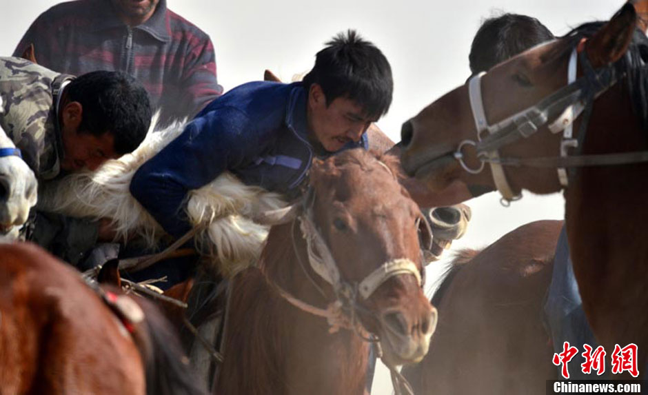 新疆罗布人村寨举办精彩骑马叼羊大赛