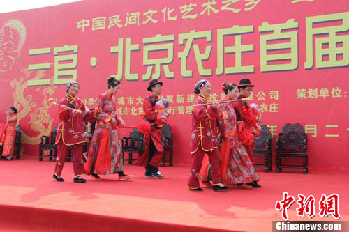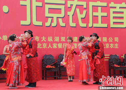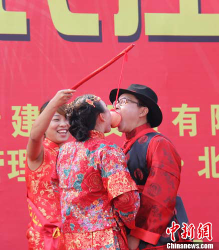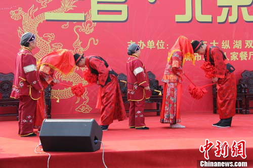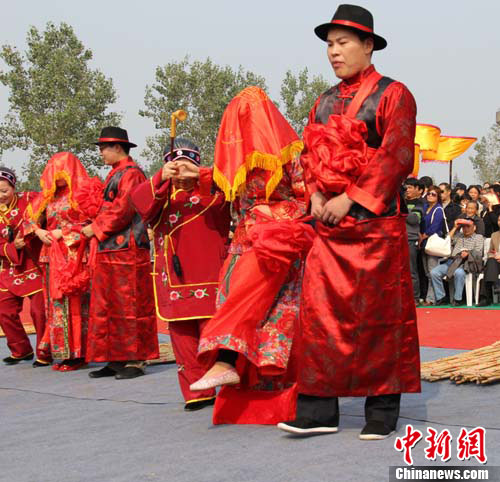 10月20日上午,一场民俗集体婚礼在江苏盐城盐都区大纵湖水乡举行。参加婚礼的6对新人按照婚礼习俗中告嫁、迎亲、婚宴程序,演绎落轿、敬茶、踏财(柴)、跨火盆、过马鞍、迈凳、三拜、挑盖头、喝合卺酒、乘喜船等全部流程,再现流行城里下河地区传统婚俗文化魅力,福娃报喜、花担悠悠、湖船荡漾、腰鼓阵阵、狮舞欢腾,吸引了四乡八邻观看。