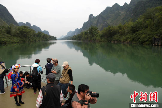 10月21日,来自香港、澳门、台湾和内地的109名书画摄影家在广西河池市大化瑶族自治县红水河百里画廊采风,这一景观河水清幽、两岸群峰屏立、竹木葱葱,乘船其中,鳞波倒映,船移景换,山光水色扑朔迷离,犹如一幅明丽清新的水墨画。中新社发 黄艳梅 摄