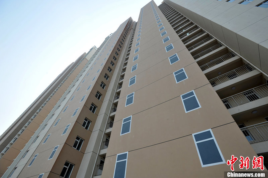 10月23日,山东省青岛市,宜昌路与兴隆三路路口的宜昌美景楼盘是经济适用房,楼体北侧外墙画上与周边窗户规格相同的“假窗”。网友调侃:经济适用房也不带这么玩儿的吧。市政务服务热线回复称,电梯井外墙未设计外窗,为达立面装饰效果,楼的楼梯间外墙上做装饰性外窗涂饰,符合规划设计图纸要求。肖建 摄