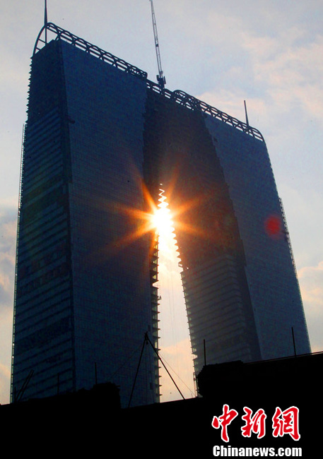 据悉,矗立于苏州工业园区金鸡湖西岸、气势恢宏的“东方之门”,相当于法国凯旋门的6倍,被誉为“世界第一门”,总高度为301.8米,其幕墙规格近百种共需16万立方米,平铺占地面积约有15个标准足球场大,该工程预计2014年底整体完工。王建中 摄 图片来源:CFP视觉中国