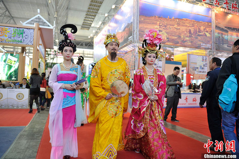 10月24日,几名演员装扮成唐明皇及其妃子,向众人推介西安旅游。当日,2013中国国际旅游交易会在春城昆明开幕,102个国家和地区参展推介旅游。中新社发 刘冉阳 摄