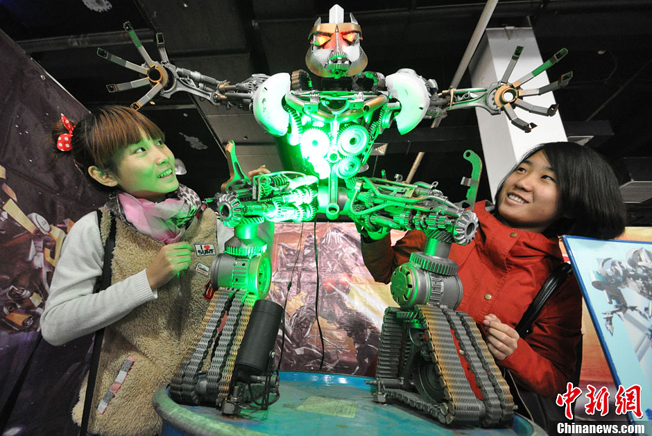 24日,“擎天柱”、“大黄蜂”、“威震天”、“红蜘蛛”、“铁皮”等38个变形金刚模型亮相河北省邯郸国际会展中心,通电后它们能说话、喷雾、摇头、发光等,它们中最大的高3米,体重将近1吨,用了大约1300多个零件,最小的高40厘米。这些变形金刚出自23名广西、广东的打工仔之手,花费近三年时间,全部由废弃的汽车、摩托车上的齿轮、钢板、排气管等零部件制作而成,意在宣传旧物回收的环保理念。马继前 摄