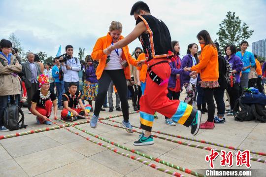 10月26日,参加第六届“汉语桥”比赛的选手们在昆明体验中国书法、画脸谱等中国传统文化,具有民族特色的竹竿舞、打陀螺等活动让现场充满欢笑。图为“汉语桥”选手与云南少数民族牵手跳起“竹竿舞”。