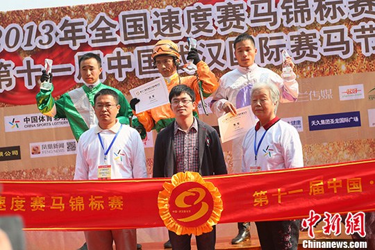 图为现场摇号产生的观众担任武汉赛马节嘉宾给骑师颁奖。中新社发 徐金波 摄