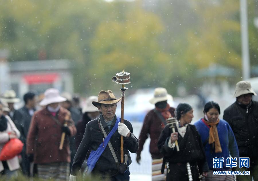 10月28日,行人走在雪中的拉萨街头。当日,来自西藏自治区气象台的消息称,受冷空气影响,西藏大部分地区出现降雪天气。 新华社记者 普布扎西 摄
