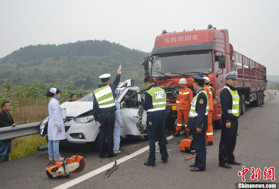 10月28日下午,四川遂(宁)内(江)高速遂宁境内金桥乡出站口前50米处发生一起三车追尾的交通事故,一车牌号为川S67291的大货车与前方一辆白色小轿车发生追尾,白色小轿车又与前方一辆黑色小车发生追尾,事故造成白色小车内2死1伤。目前,伤者已送当地医院救治,事故具体原因高速交警正在调查中。图为交警和消防官兵等正在现场展开营救。中新社发 熊裕 摄