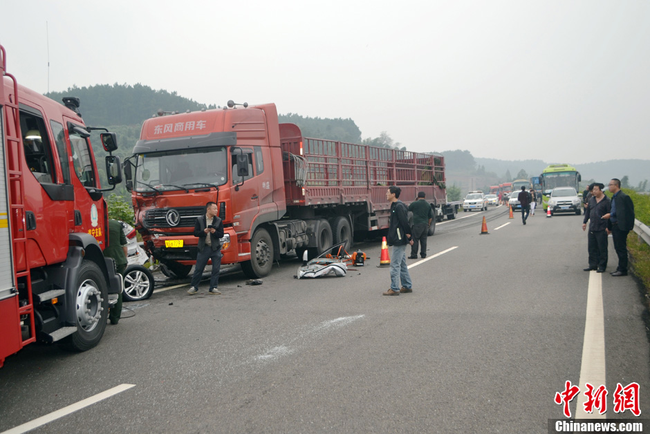 10月28日下午,四川遂(宁)内(江)高速遂宁境内金桥乡出站口前50米处发生一起三车追尾的交通事故,一车牌号为川S67291的大货车与前方一辆白色小轿车发生追尾,白色小轿车又与前方一辆黑色小车发生追尾,事故造成白色小车内2死1伤。目前,伤者已送当地医院救治,事故具体原因高速交警正在调查中。图为事故现场。中新社发 熊裕 摄