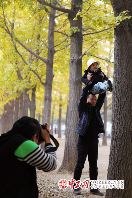 2013年10月31日,京城大气透明度和能见度再次转差,北京钓鱼台银杏大道树叶也笼罩在雾霾中,虽然还没出现“黄金大道”壮观景色,但已吸引了众多游客和摄影爱好者前来观赏、拍摄。    中工网记者 段瑜摄