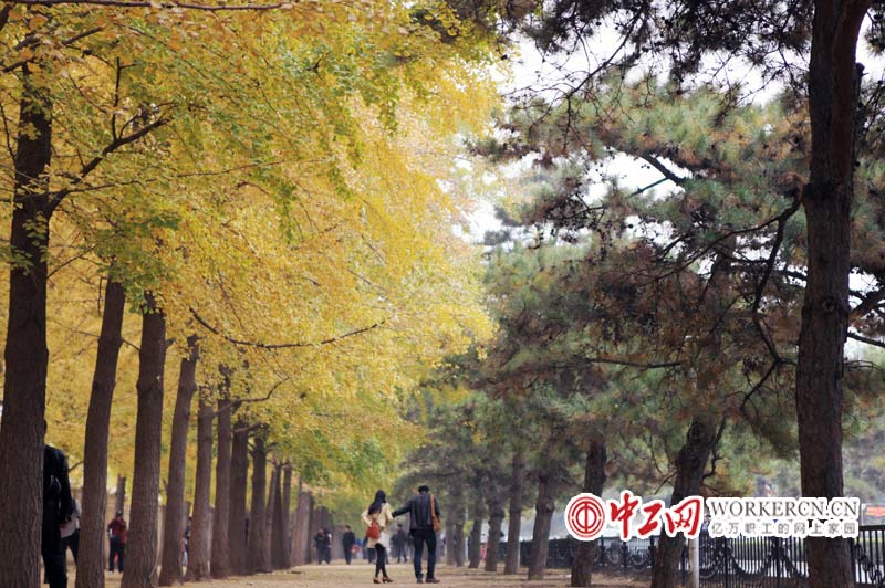 2013年10月31日,京城大气透明度和能见度再次转差,北京钓鱼台银杏大道树叶也笼罩在雾霾中,虽然还没出现“黄金大道”壮观景色,但已吸引了众多游客和摄影爱好者前来观赏、拍摄。    中工网记者 段瑜摄