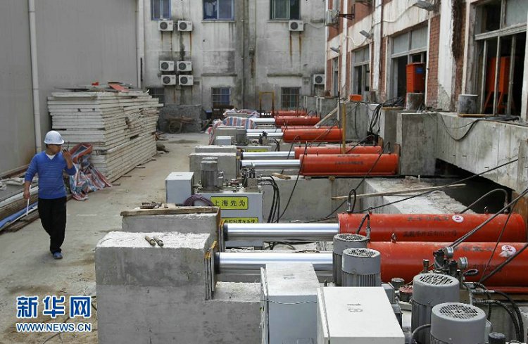 用于平移大楼的千斤顶。当日,位于上海市杨浦区的梅林正广和大楼平移工程启动。这是一幢已经有近80年历史的老楼,计划用20天整体“挪步”38米。这也是上海迄今为止规模最大的历史建筑平移工程。据了解,梅林正广和大楼共有六层,总高22米,占地面积超过1300平方米,建筑面积达7000平方米,总重约1.2万吨。大楼始建于1935年,1999年被列为“上海市优秀历史建筑”。近年来,上海市杨浦区北外滩地块面临整体开发,为了配合建设需要,经过多次的方案讨论、审批,最终决定将大楼实施平移。新华社发 (丁汀 摄)