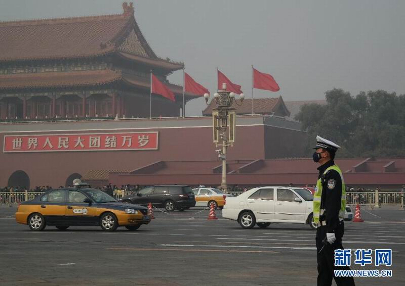11月2日,一名交警戴着口罩在天安门广场执勤。当日,北京笼罩在雾霾中。当日14时,北京市环保监测中心的实时发布平台显