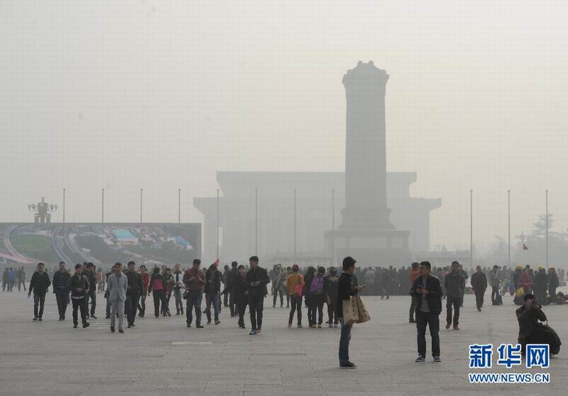 11月2日,游客在雾霾中的天安门广场游玩。当日,北京笼罩在雾霾中。当日14时,北京市环保监测中心的实时发布平台显示,北