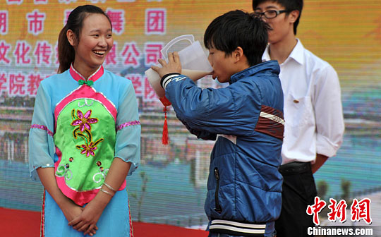 11月6日,福建三明会展中心广场举行喝擂茶比赛。比赛规定最短的时间内喝完1.5升擂茶获胜,最终一名选手以45秒的时间夺冠。中新社发 吕明 摄
