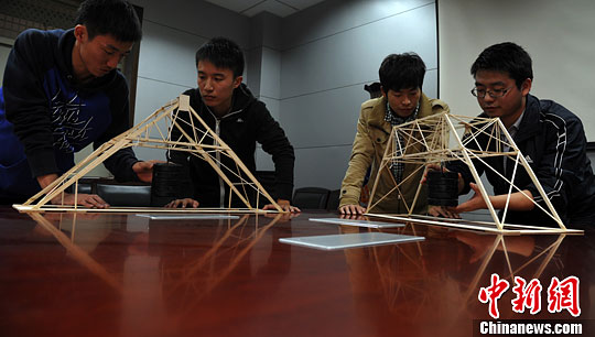 11月7日,安徽省合肥工业大学的学生展示空间大跨结构设计作品的承重能力。中新社发 韩苏原 摄