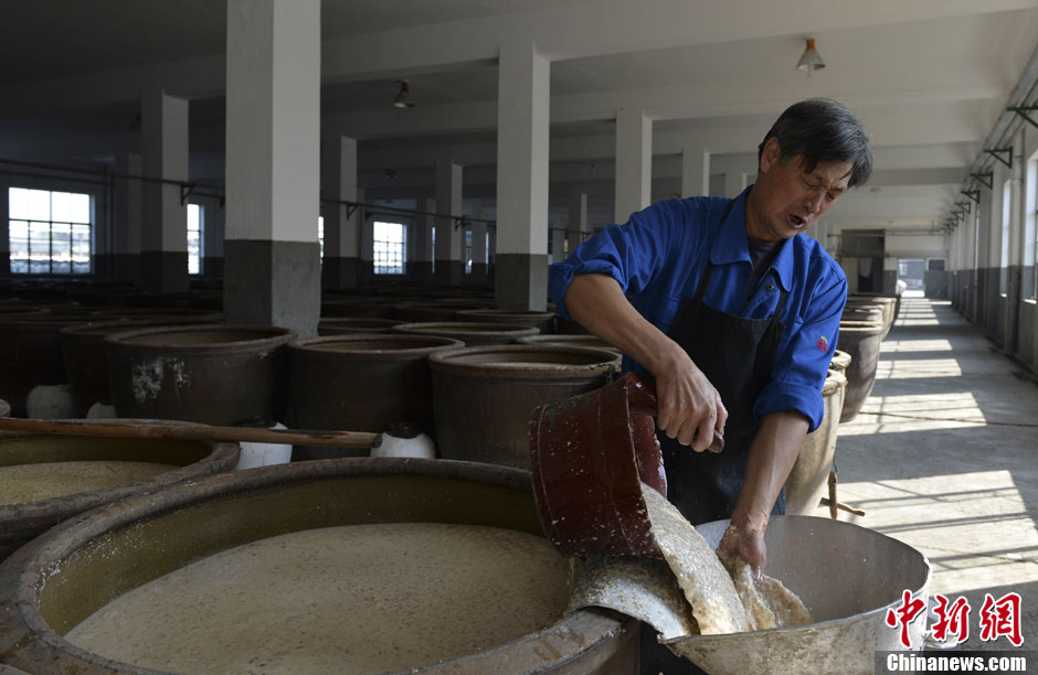 图为酿酒师傅们正在将前发酵的酒装入陶坛进入后发酵。中新社发 袁云 摄