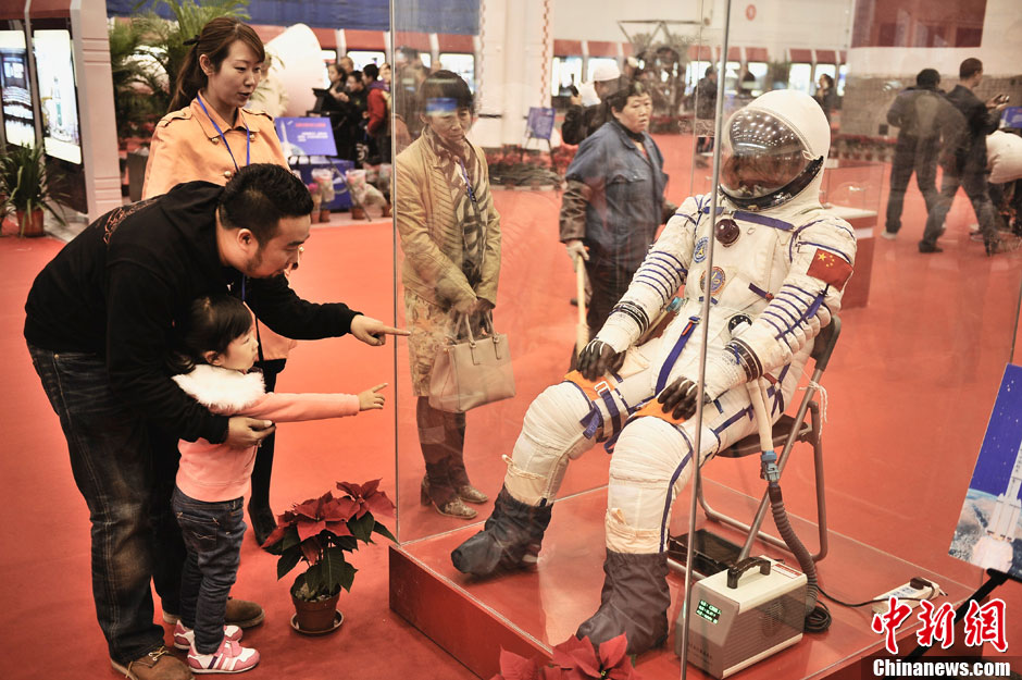 11月9日,天津国际展览中心,一名儿童在家长的陪伴下参观航天员舱内服。当日,为期16天的“圆梦太空——中国载人航天展”在天津举行。中新社发 佟郁 摄