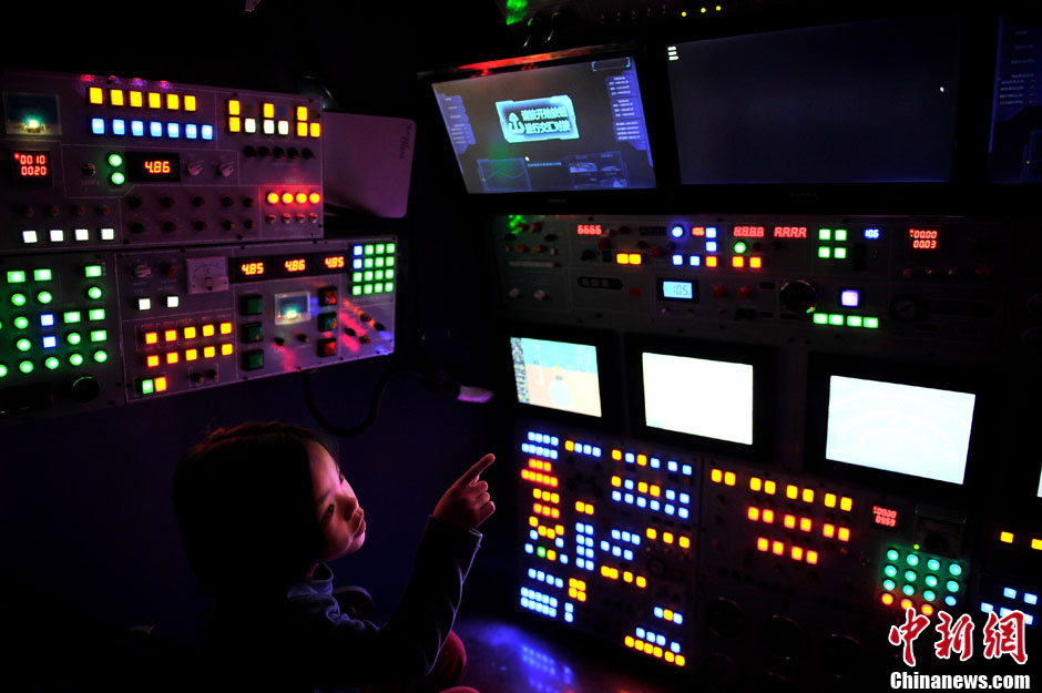11月9日,天津国际展览中心,一名小学生在体验神十飞船返回舱模拟器。当日,为期16天的“圆梦太空——中国载人航天展”在天津举行。中新社发 佟郁 摄