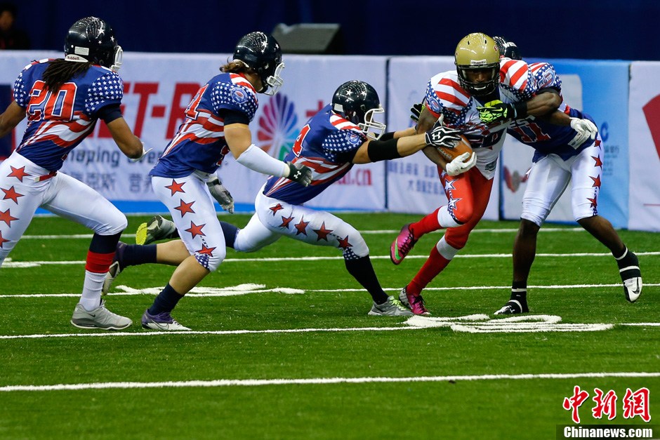 11月10日,美国职业室内橄榄球表演赛在北京举行,这是美国职业室内橄榄球队首次来华表演比赛。来自费城东部明星队和亚利桑那西部明星队由美国室内橄榄球联盟(AFL)俱乐部的球员选拔组成,代表了全美职业室内橄榄球的最高水平。美式室内橄榄球与美式场地橄榄球比赛基本相同,尤其是场地紧凑、攻防转换快、得分更多,且更具观赏性。目前,北京体育大学、天津体育学院、山东体育学院等6所体育院校已经组建了美式室内橄榄球队,标志着其正式进入中国。中新社发 富田 摄