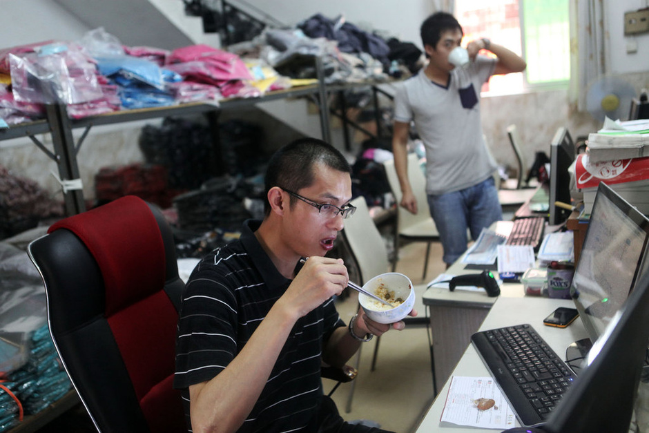 又逢“双十一”,在这个人造节日背后,是屏幕另一侧的淘宝店主们。他们享受着节日的福利,也承担着运营小店带来的辛劳。图为2013年5月18日,广东东莞,中午了,为了更好的服务买家,淘宝店的客服们边吃饭边关注着买家的问题。