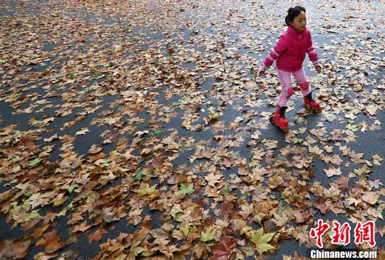 11月10日,一名孩子在落满树叶的南京东南大学校园内滑滑轮。中新社发 泱波 摄