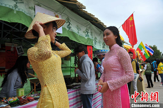 11月11日,云南民族大学第六届东南亚南亚文化节在昆明开幕,来自泰国、马来西亚、印度等多个国家的各式特色商品展出,受到少数民族大学生们的热烈欢迎。据了解,此次文化节共举办3天,除了文化展示外,还将举办泰国语、缅甸语、越南语等多语种的演讲比赛。