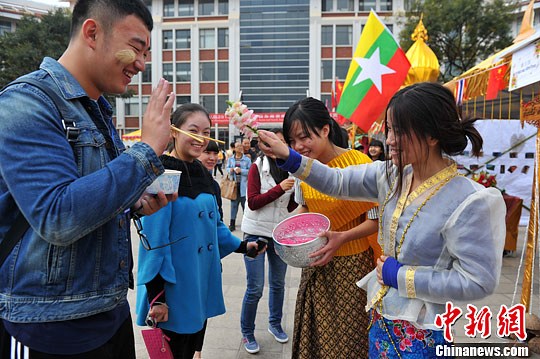 图为泼水送祝福。中新社发 任东 摄
