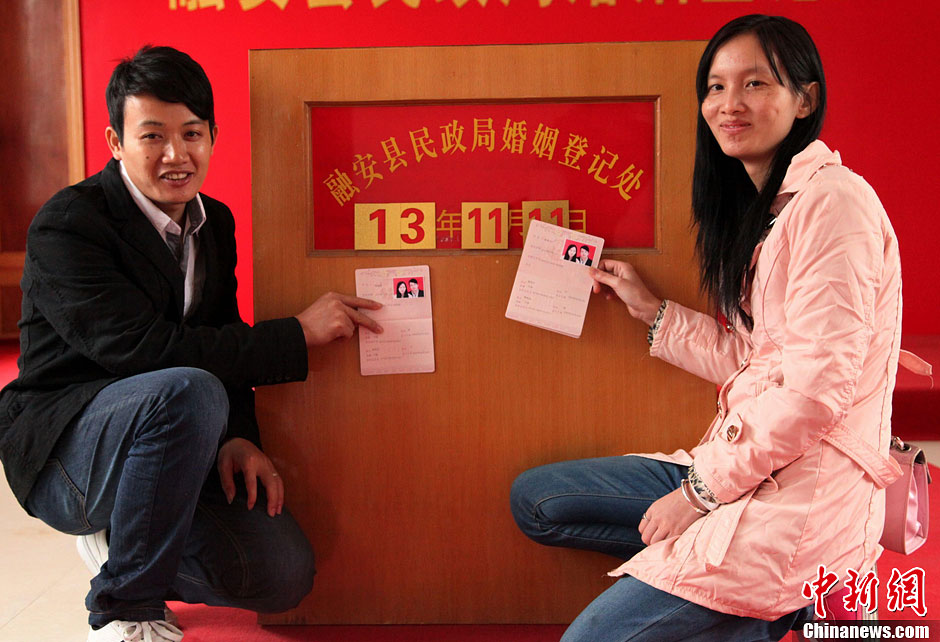 11月11日是中国流行于年轻人的 “光棍节”,当日,地处广西桂北山区的柳州市融安县,适龄青年摈弃以往看黄历、择吉日的习俗,纷纷选择在这个娱乐性节日登记结婚,让自己在“光棍节”实现“脱光”。图为11月11日,在融安县民政局婚姻登记处一对刚刚“领证”的新人在“13年11月11日”的日期前留影。黄国良 摄