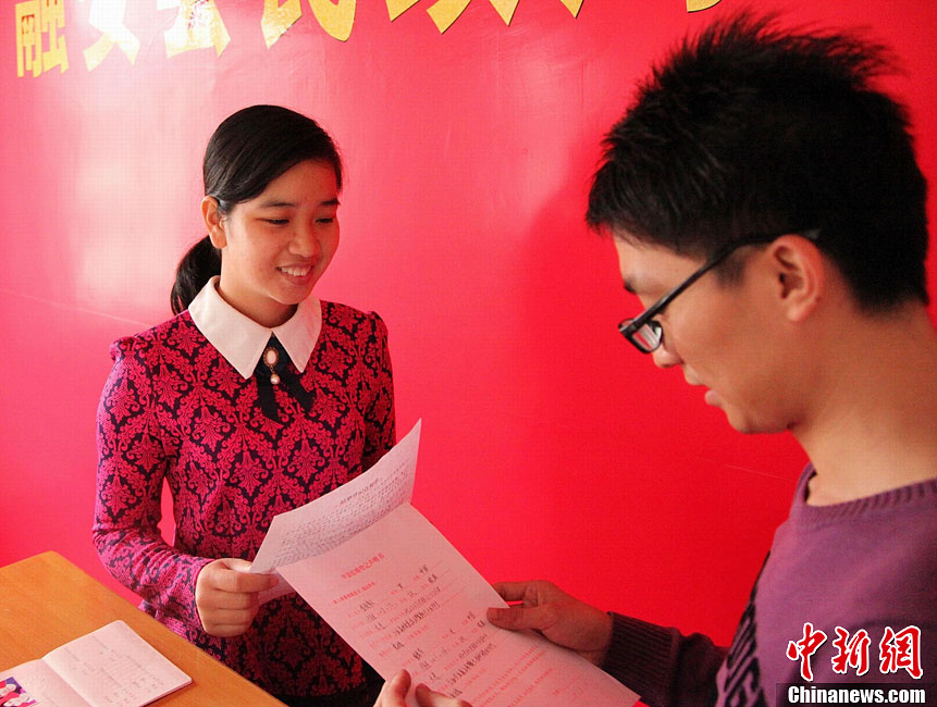 11月11日,在融安县民政局婚姻登记处一对新人在宣读“婚姻声明书”向对方许下一辈子的甜蜜诺言。黄国良 摄
