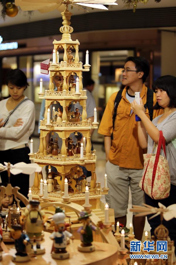 11月10日,观众在“德国圣诞市集”欣赏来自德国的木制工艺品。一个由德国知名木工艺品牌精心打造的“德国圣诞市集”近日落户香港。市集内展示了近千件来自德国的圣诞题材木制工艺品。 新华社记者李鹏摄