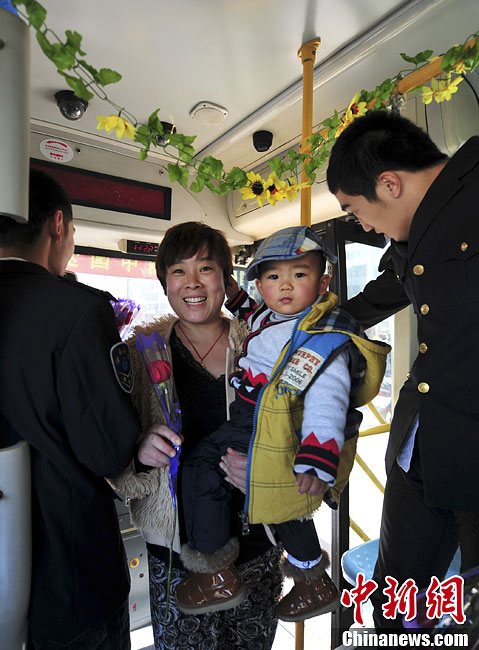 11月11日,公交人员给乘客献花送祝福。11月11日上午11时11分,济南公共交通公司11路公交车司乘人员在该路车第11号站牌处,向乘客献玫瑰送祝福,在“光棍节”日演绎别样的关爱情。中新社发 张勇 摄