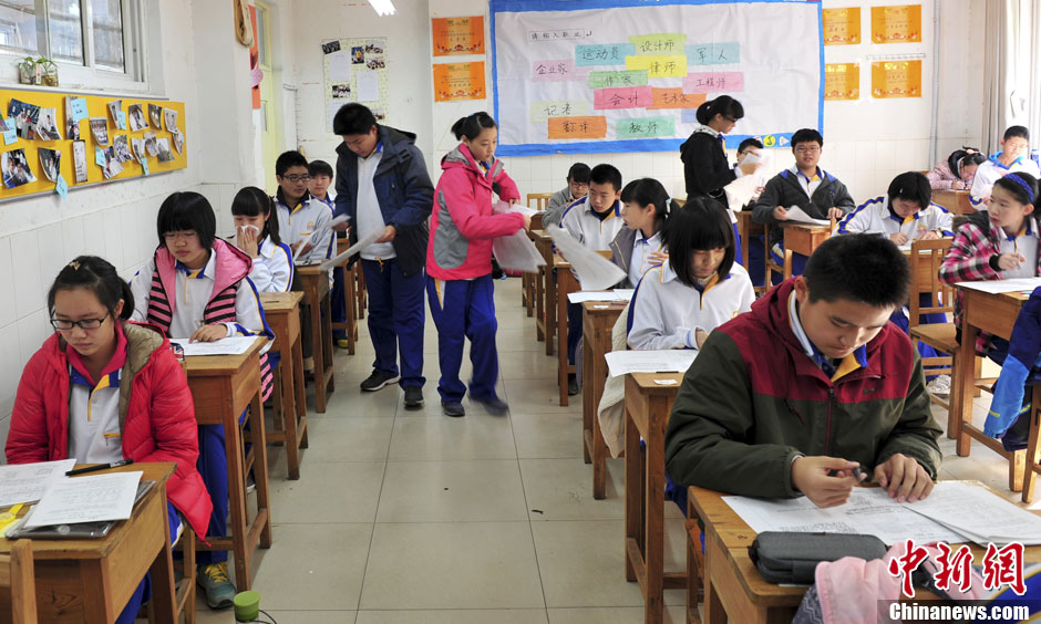 11月12日,考试结束,学生自觉收笔交卷。中新社发 张勇 摄