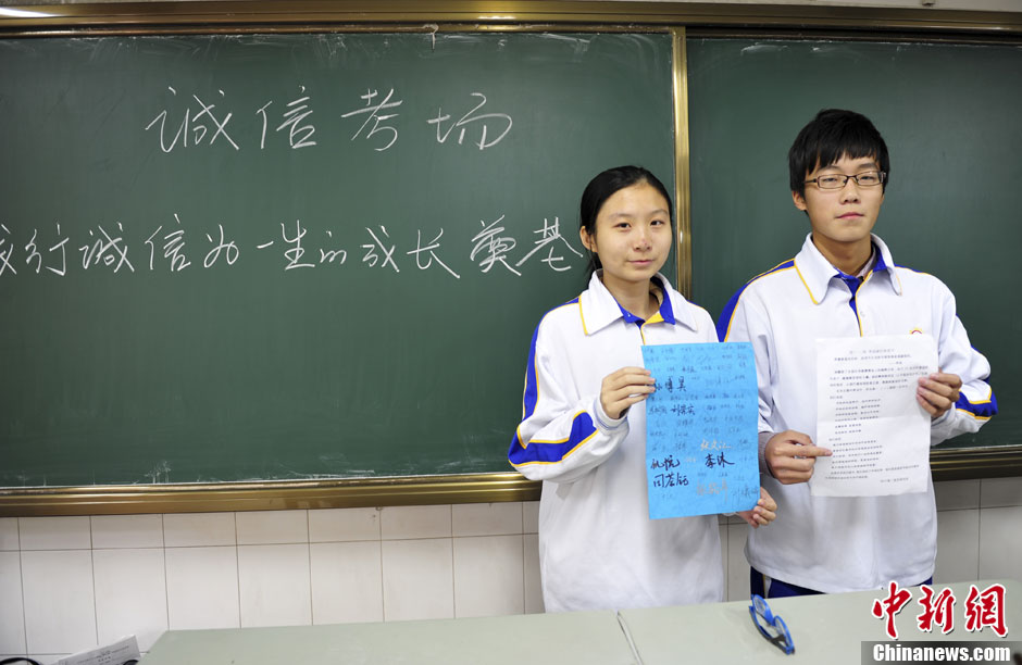 11月12日,学生签署“诚信公约”,履行诚信考试承诺。中新社发 张勇 摄