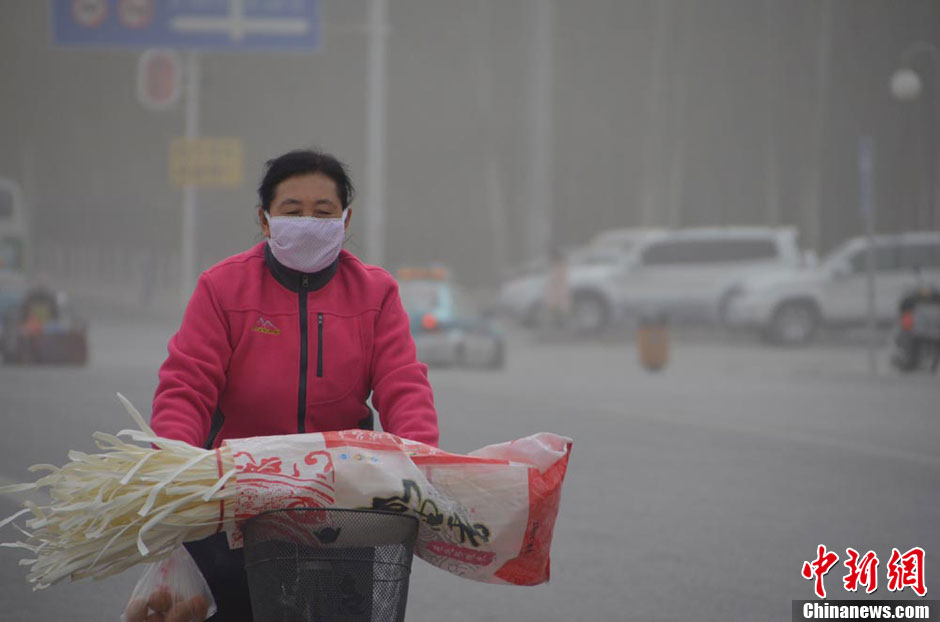 11月12日,甘肃酒泉玉门市城区笼罩在沙尘天气之中,给当地民众出行带来了很大不便。当日,酒泉市气象台发布沙尘蓝色预警信号:预计未来12小时酒泉市境内的肃州区、瓜州、敦煌、玉门等地将出现大风沙尘降温天气,气温下降4-7摄氏度,局部能见度在200米左右,并伴有扬沙天气。万宗平 摄