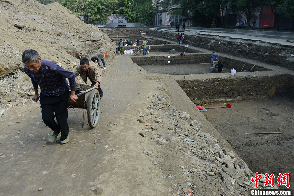 11月12日,位于成都市体育中心内的明代蜀王府遗址正在发掘中。据现场考古工作人员介绍,近日为配合成都体育中心篮球场工程建设,成都市考古队对工地进行例行勘探,考古人员在此发现了蜀王府遗址。在已出土的文物中,主要是从宋代至明清的器物和生活遗迹。蜀王府,即明代朱元璋之子朱椿的府邸,始建于1385年。图为发掘现场。中新社发 张浪 摄