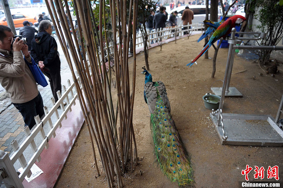 11月13日,武汉汉口南京路上的一家餐馆,在门前花坛内养了孔雀、金刚鹦鹉和黑、白天鹅等10种鸟类,俨然一个袖珍“鸟语林”。闹市闻鸟鸣成为一道风景,也为餐馆赚足人气。中新社发 张畅 摄
