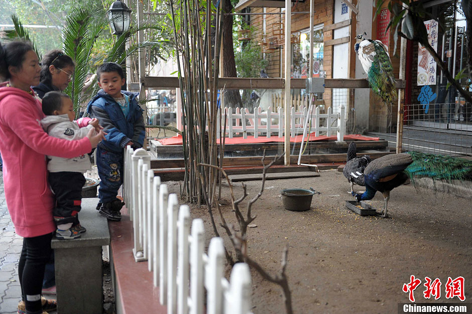 11月13日,武汉汉口南京路上的一家餐馆,在门前花坛内养了孔雀、金刚鹦鹉和黑、白天鹅等10种鸟类,俨然一个袖珍“鸟语林”。闹市闻鸟鸣成为一道风景,也为餐馆赚足人气。中新社发 张畅 摄