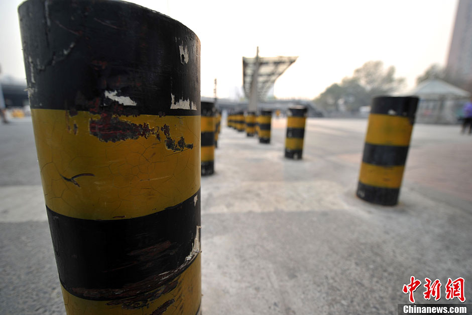 11月13日,北京刘家窑地铁站出口外,便道的人行横道被钉上了数十根金属地桩,宽约5米的道路密布粗细不同的“梅花桩”。但早晚高峰“摩的”、“黑车”依旧在地铁口排起长队拉活揽客,地桩反而成为市民通行的障碍。附近治安岗亭值班民警介绍,原本街道设置隔离柱的目的是防止车辆穿行休闲广场,杜绝安全隐患,尤其夏天广场乘凉的群众比较多,车辆穿行很容易发生危险。但现在这些大大小小的“梅花桩”给市民出行也带来了不便。中新网记者 金硕 摄