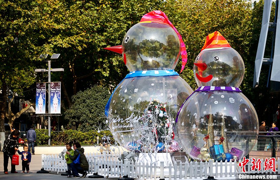 11月13日,两尊透明的雪人出现在南京街头,高大却不失可爱的模样憨态可掬。虽然离圣诞节还有一个多月,不少商家已经提前开始布置店堂内外,营造购物气氛抢占商机。中新社发 泱波 摄