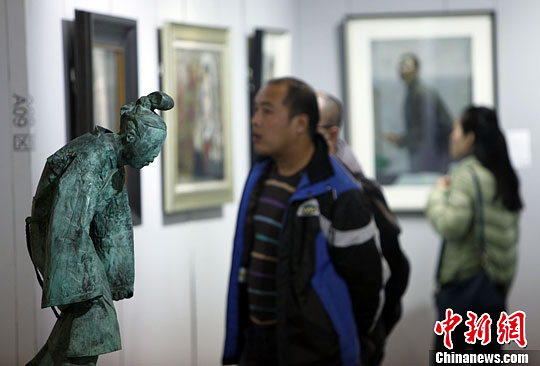 在拍卖会预展中,众多新生代油画雕塑作品进入拍卖市场流通。多年以来,传统的中国书画一直堪当中国艺术品市场挑大梁的角色,新生代油画雕塑、影像作品、酒类及名表珠宝等拍卖门类在不断的革新与摸索中寻求市场。中新社发 杨可佳 摄