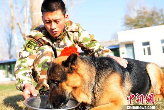 11月13日,临退伍老兵吕石头最后一次给自己心爱的警犬“道龙”喂食。范昕羽 摄