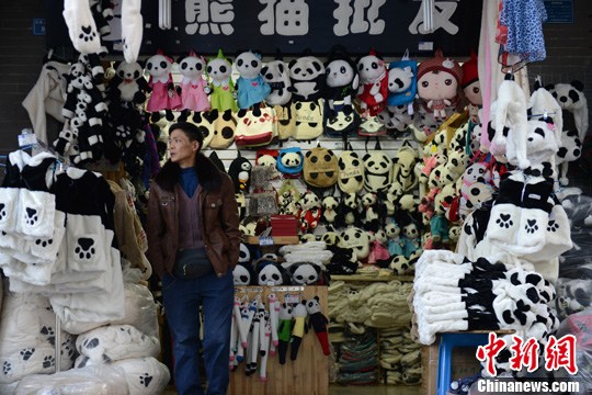 11月14日,成都一销售各种样式大熊猫饰品的“熊猫批发”店等待顾客。中新社发 张浪 摄