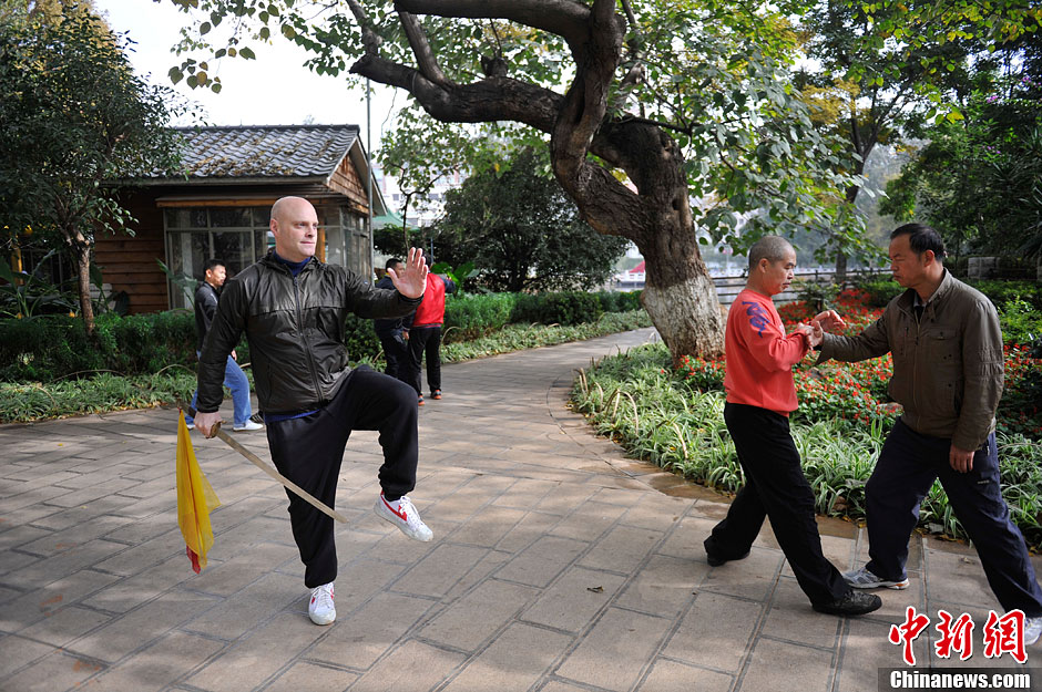11月14日,杰克在进行推手指导。老外教中国功夫听起来不可思议,但在云南昆明就有这么一位洋教练。40岁的英国人杰克是一个中国功夫的狂热爱好者,早在20年前在英国时,就跟着一个香港师傅学起了咏春拳。后来迷上了“慢悠悠、软绵绵”的太极拳,一练就是10年。自从在昆明定居后,每天早上都在翠湖公园免费传授太极拳,只要有人请教,杰克都毫无保留的传授。目前,杰克的弟子已有20多人。中新社发 刘冉阳 摄