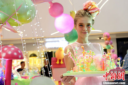 11月14日,靓女模特展示澳洲著名艺术家组合“Pip & Pop”设计的精美彩糖小摆设。当天,大型梦幻糖果国度圣诞装饰在一家商场开幕。场内呈现梦幻又甜美的糖果仙境。中新社发 洪少葵 摄