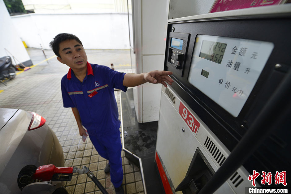 11月14日,海口市区某加油站的工作人员正在为市民加油。国家发改委当日发布消息表示,决定自11月15日零时起降低国内成品油价格,汽、柴油价格每吨分别降低160元和155元。中新社发 骆云飞 摄